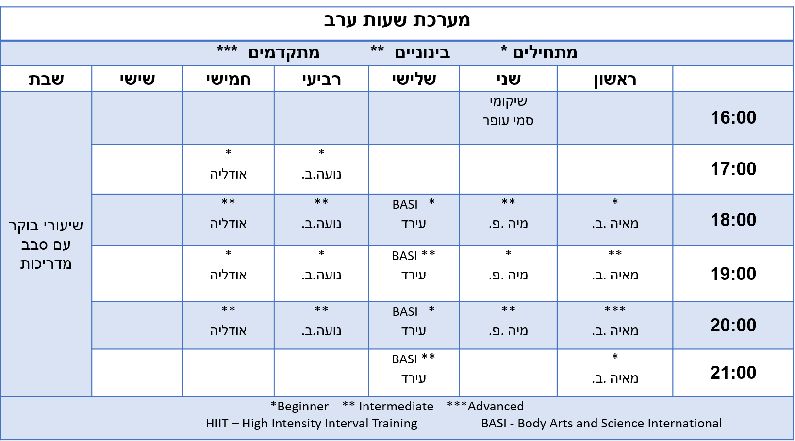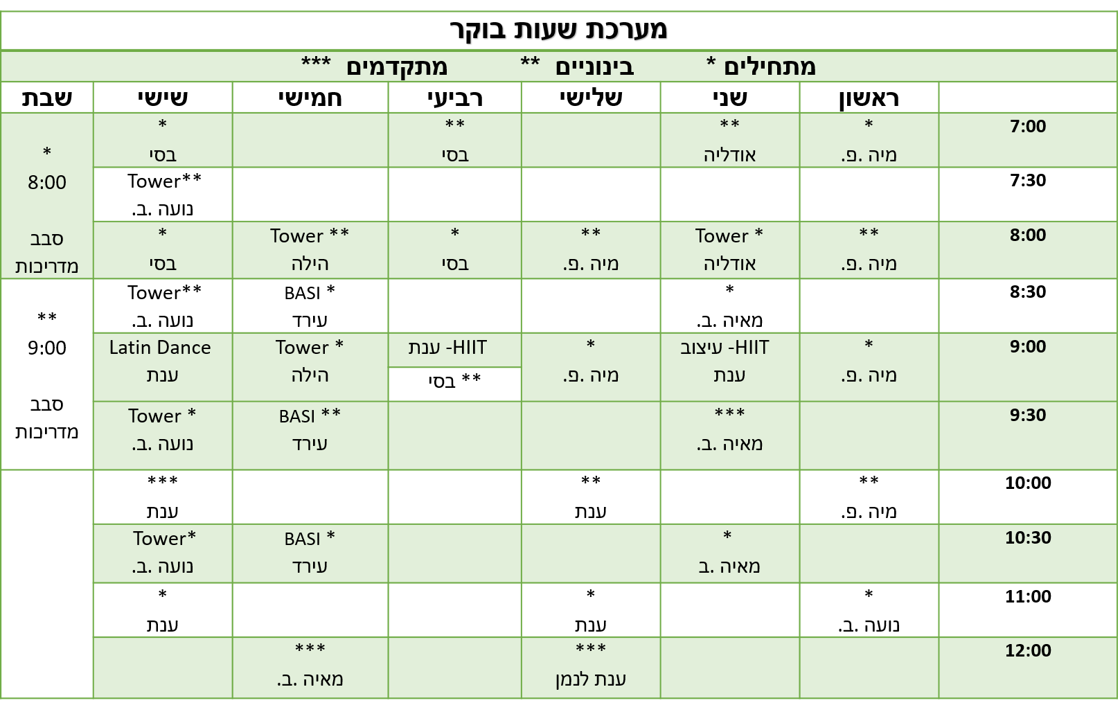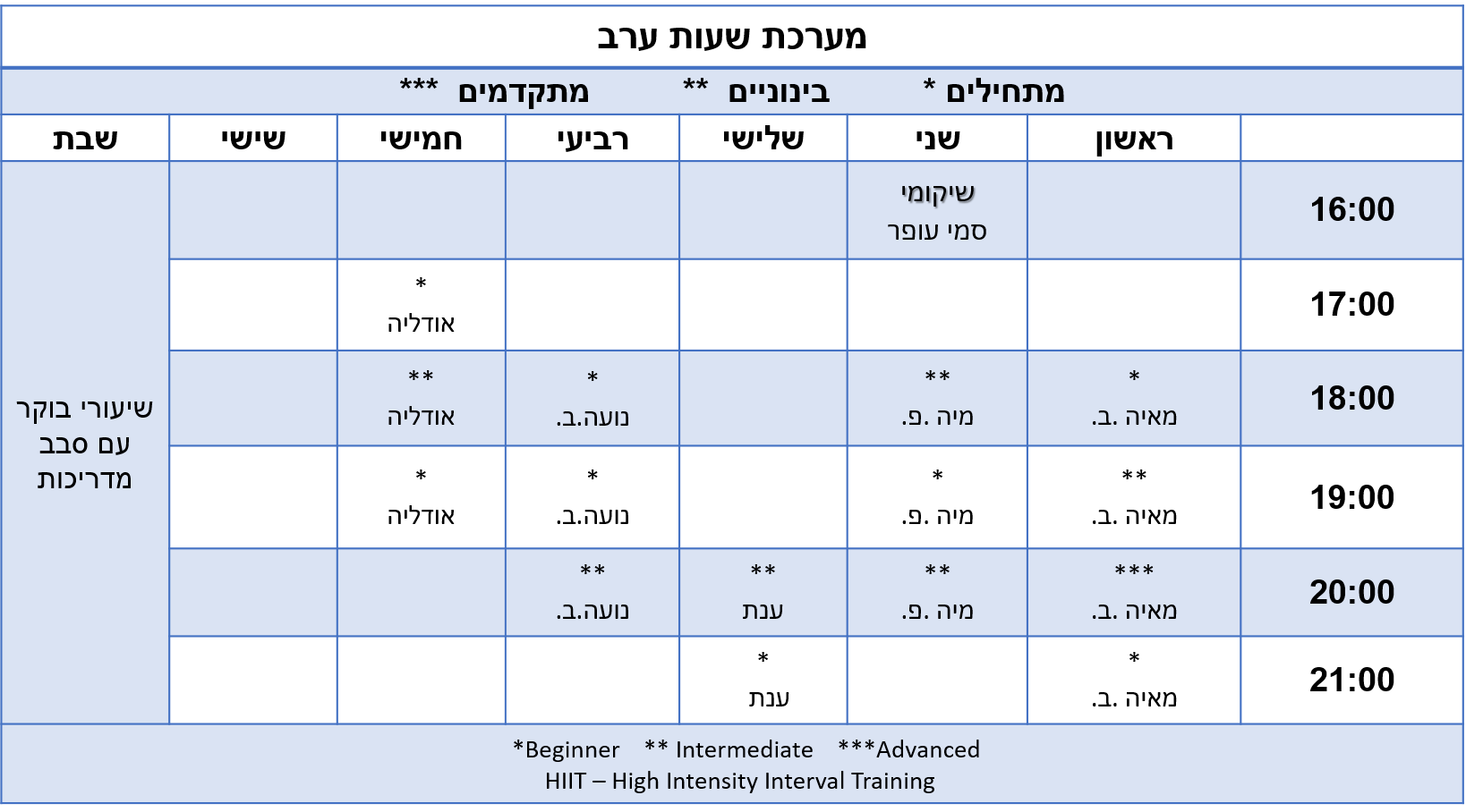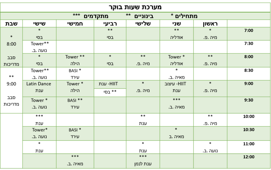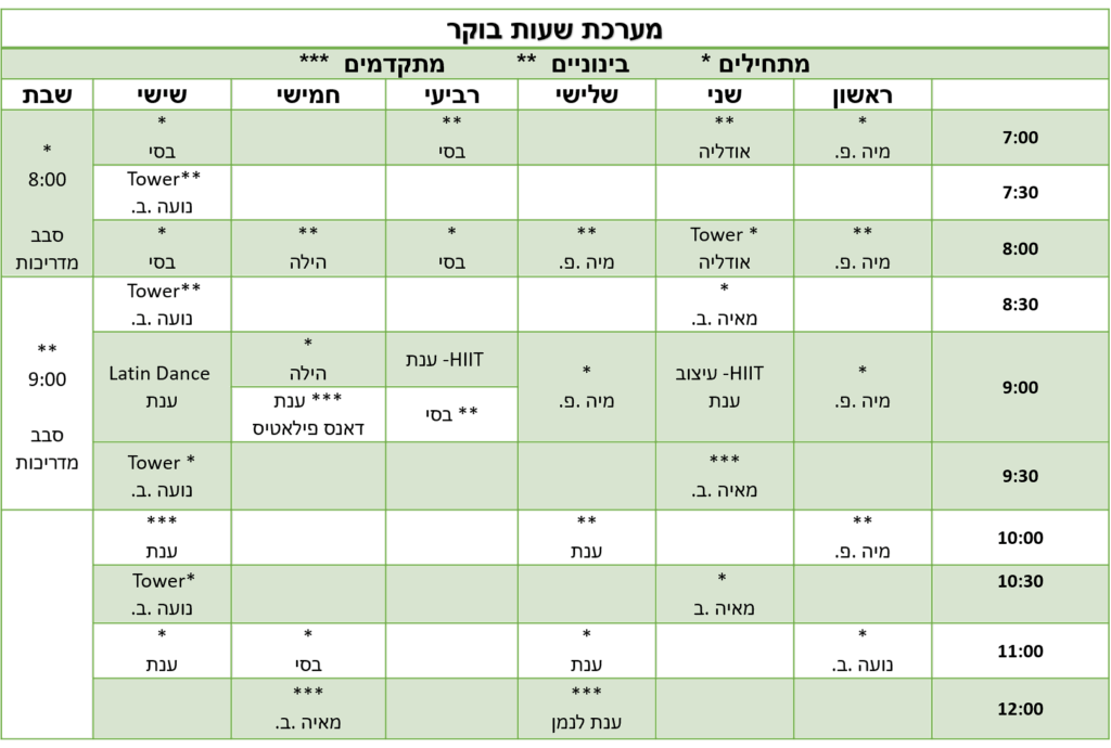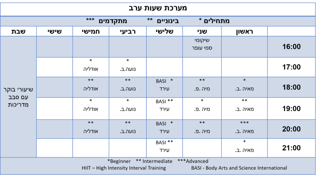 מערכת שעות מערכת שעות Schedule נהלי הסטודיו כדי שיהיה לכולנו נעים ונוח בבקשה שימו לב ביטול מנוי – הודעה של 30 יום מראשביטול שיעור באפליקציה – עד 8 שעות לפני השיעורביטול שיעור דרך המשרד – עד 24 שעות לפני השיעור רישום לשיעורי בונוס – בטווח של 8 שעות מהשיעורבבקשה לעדכן אי הגעה גם אם עבר זמן הביטולנא להביא מגבת אישית ובקבוק מים לחצו על התמונה להגדלה: לחצו על התמונה להגדלה: